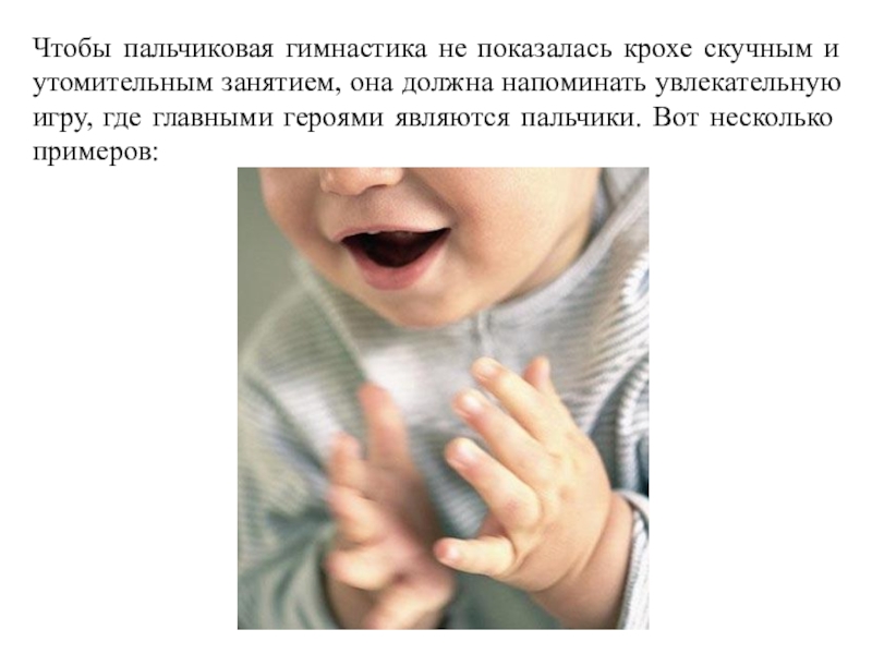 Слайд 8Чтобы пальчиковая гимнастика не показалась крохе скучным и утомительным занятием, она