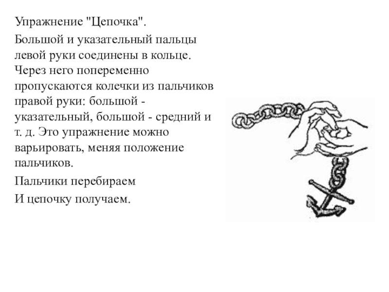 него попеременно пропускаются колечки из пальчиков правой руки: большой - указательный, большой - средний и т. д. Это упражнение можно варьировать, меняя положение пальчиков.