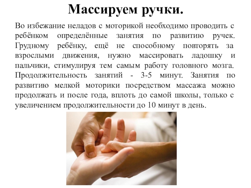 занятия по развитию ручек. Грудному ребёнку, ещё не способному повторять за взрослыми движения, нужно массировать ладошку и пальчики, стимулируя тем самым работу головного мозга. Продолжительность занятий - 3-5 минут. Занятия по развитию мелкой моторики посредством массажа можно продолжать и после года, вплоть до самой школы, только с увеличением продолжительности до 10 минут в день.
