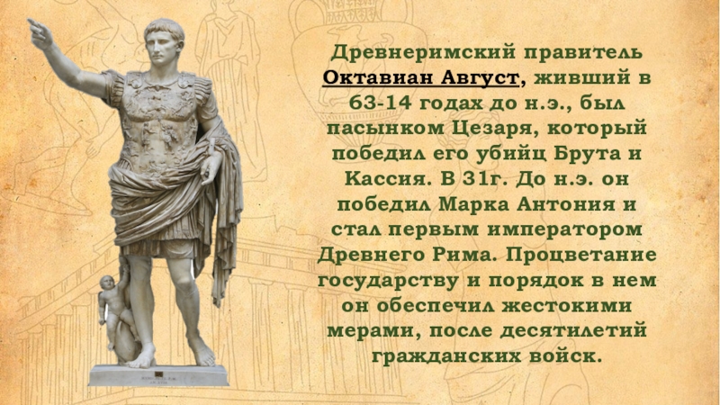 пасынком Цезаря, который победил его убийц Брута и Кассия. В 31г. До н.э. он победил Марка Антония и стал первым императором Древнего Рима. Процветание государству и порядок в нем он обеспечил жестокими мерами, после десятилетий гражданских войск.