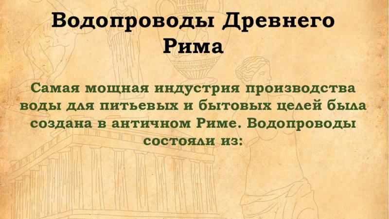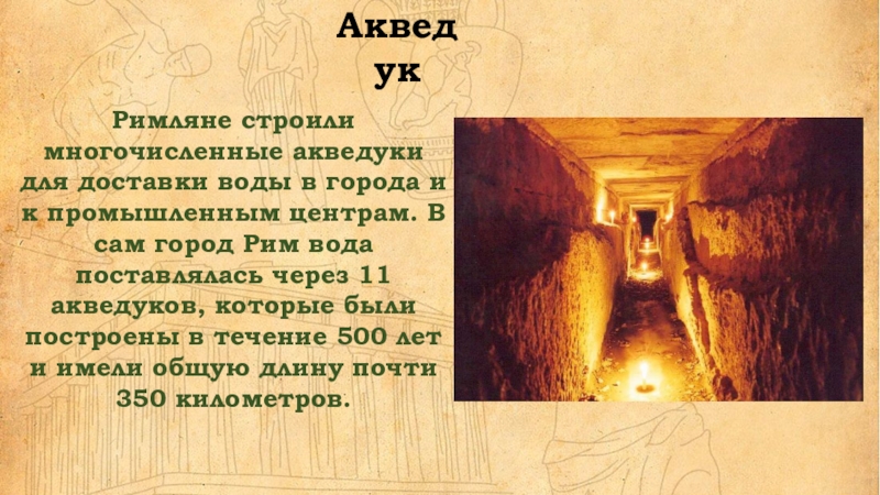 промышленным центрам. В сам город Рим вода поставлялась через 11 акведуков, которые были построены в течение 500 лет и имели общую длину почти 350 километров.
