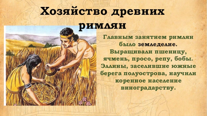 Главным занятием римлян было земледелие. Выращивали пшеницу, ячмень, просо,