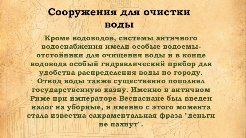 для очищения воды и в конце водовода особый гидравлический прибор для удобства распределения воды по городу. Отвод воды также существенно пополнял государственную казну. Именно в античном Риме при императоре Веспасиане был введен налог на уборные, и именно с этого момента стала известна сакраментальная фраза "деньги не пахнут".