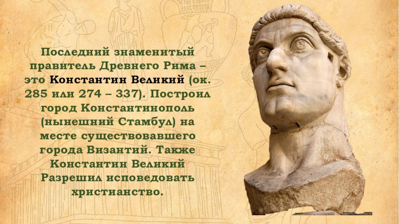 Слайд 9Последний знаменитый правитель Древнего Рима – это Константин Великий (ок. 285