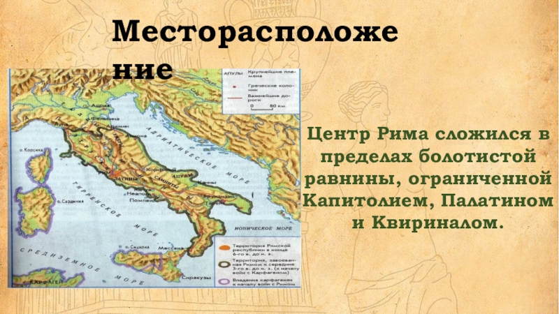 Слайд 3Центр Рима сложился в пределах болотистой равнины, ограниченной Капитолием, Палатином и