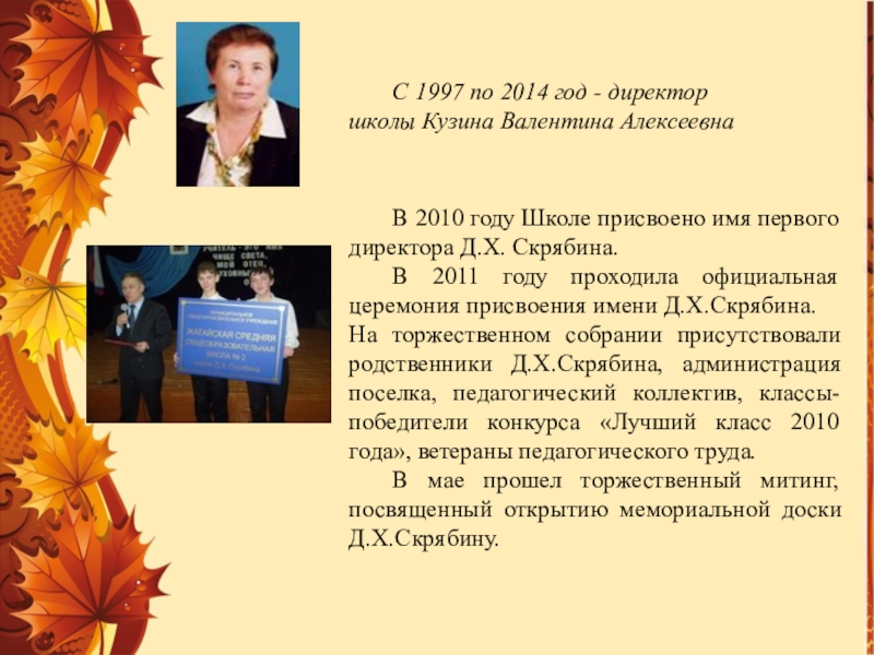 В 2010 году Школе присвоено имя первого директора Д.Х. Скрябина.
