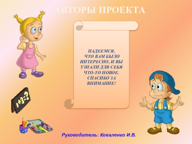Это сайт презентаций, где можно хранить и обмениваться своими презентациями, докладами, проектами, шаблонами в формате PowerPoint с другими пользователями. Мы помогаем школьникам, студентам, учителям, преподавателям хранить и обмениваться учебными материалами.
