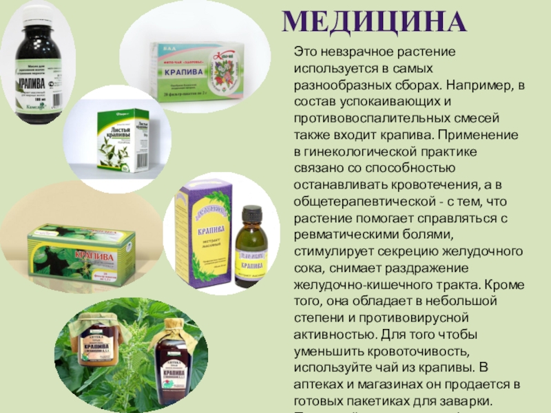 успокаивающих и противовоспалительных смесей также входит крапива. Применение в гинекологической практике связано со способностью останавливать кровотечения, а в общетерапевтической - с тем, что растение помогает справляться с ревматическими болями, стимулирует секрецию желудочного сока, снимает раздражение желудочно-кишечного тракта. Кроме того, она обладает в небольшой степени и противовирусной активностью. Для того чтобы уменьшить кровоточивость, используйте чай из крапивы. В аптеках и магазинах он продается в готовых пакетиках для заварки. Принимайте из расчета 1/2-1 стакан отвара 3 раза в день. -