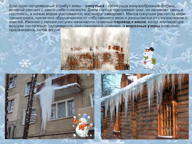 льда конусообразной формы, который свисает с какой-либо плоскости. Днем солнце прогревает снег, он начинает таять и подтекать, а ночью мороз усиливается, все вокруг замерзает. Масса сосульки растет по мере таяния снега, потом она обрушивается от собственного веса и рассыпается от столкновения с землей. Именно с таяния сосулек начинается плавный переход к весне, когда температура воздуха постепенно поднимается, дни становятся длиннее, а морозные узоры исчезают, просачиваясь талой водой в прогретую землю