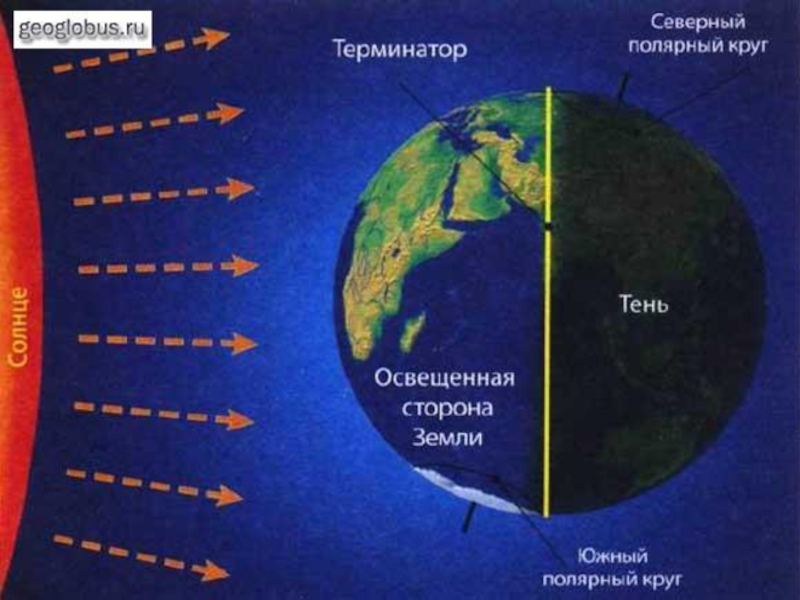 - Посмотрите на землю и солнце. Земля вращается вокруг своей оси, солнце освещает то одну сторону планеты, то другую. Там где освещенная сторона день, а где темная сторона- ночь.