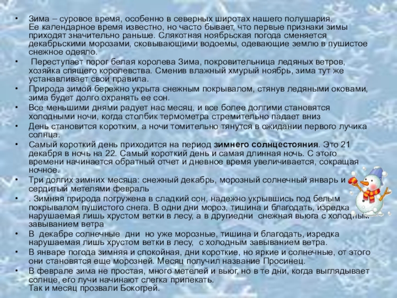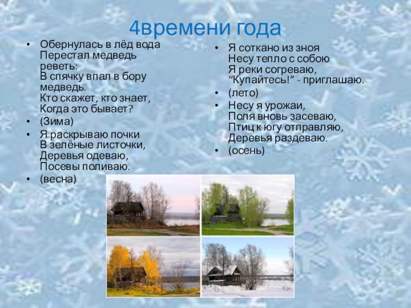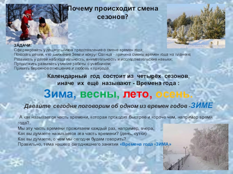 Правильно, тема нашего сегодняшнего занятия «Времена года -ЗИМА»