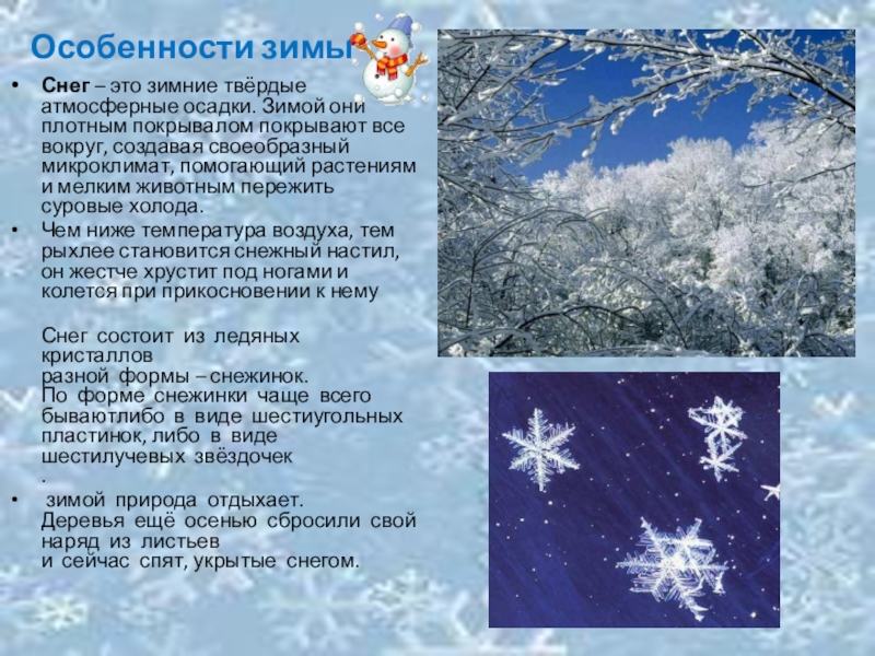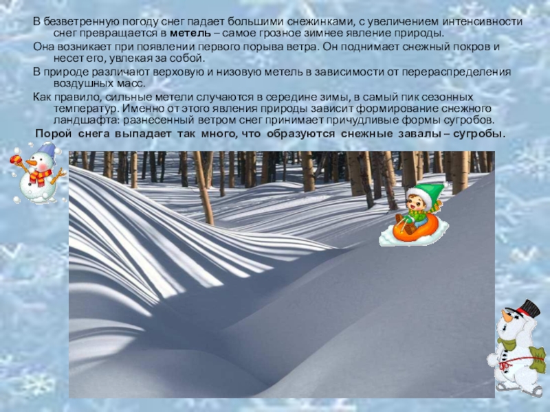 Слайд 24В безветренную погоду снег падает большими снежинками, с увеличением интенсивности снег