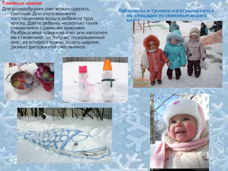 полстаканчика воды и добавьте туда краску. Дайте ребенку несколько таких стаканчиков с разными красками. Разбрызгивая краски на снег или наполняя им стаканчики, он получит подкрашенный снег, из которого можно делать шарики, разные фигурки или снеговичков.