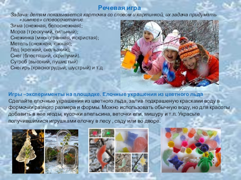 Игры –эксперименты на площадке. Елочные украшения из цветного льда