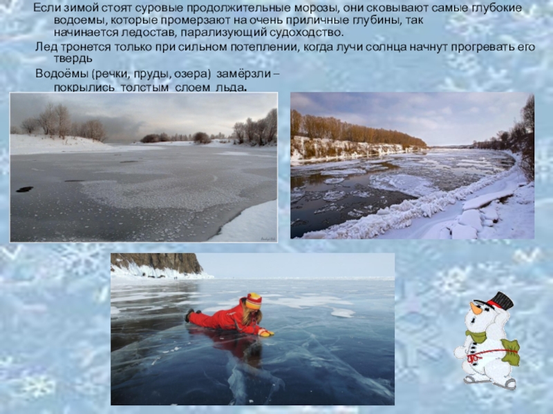 Слайд 27Если зимой стоят суровые продолжительные морозы, они сковывают самые глубокие водоемы,