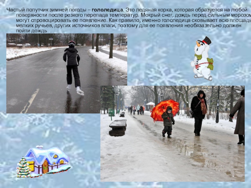 Слайд 26Частый попутчик зимней погоды – гололедица. Это ледяная корка, которая образуется на