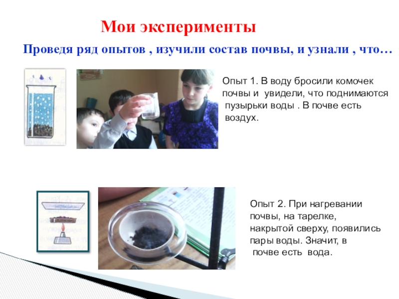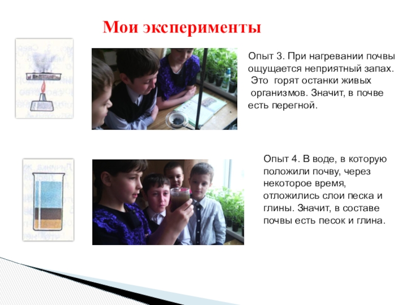 Опыт 4. В воде, в которую положили почву, через некоторое время, отложились слои песка и глины. Значит, в составе почвы есть песок и глина.