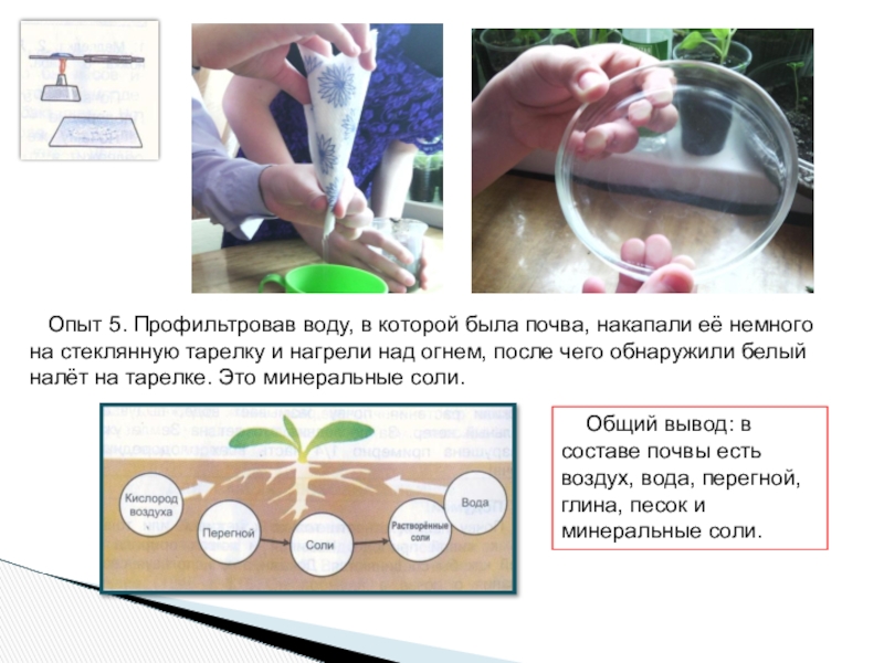 Общий вывод: в составе почвы есть воздух, вода, перегной, глина, песок и минеральные соли.