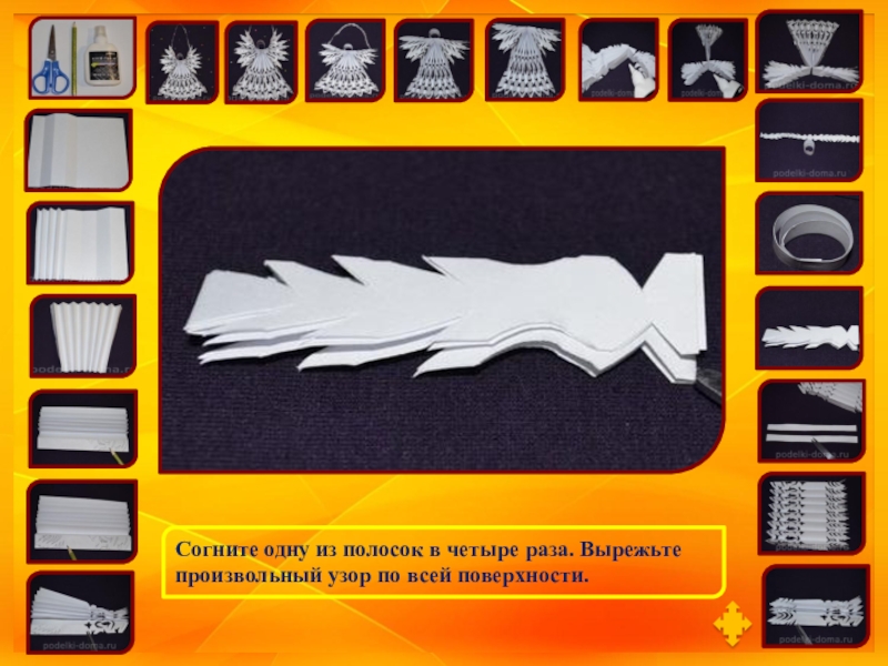 Слайд 14Согните одну из полосок в четыре раза. Вырежьте произвольный узор по