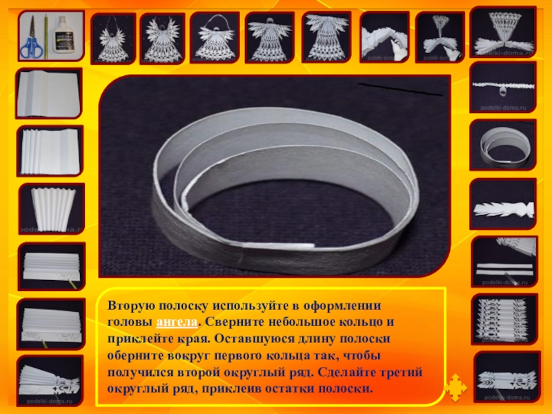 Слайд 15Вторую полоску используйте в оформлении головы ангела. Сверните небольшое кольцо и приклейте