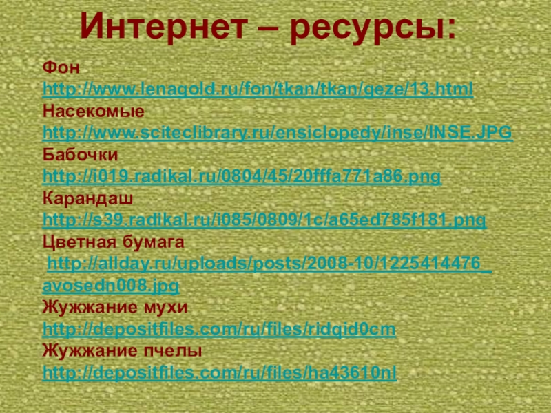 Интернет – ресурсы: Фон http://www.lenagold.ru/fon/tkan/tkan/geze/13.htmlНасекомые http://www.sciteclibrary.ru/ensiclopedy/inse/INSE.JPG Бабочки http://i019.radikal.ru/0804/45/20fffa771a86.pngКарандаш http://s39.radikal.ru/i085/0809/1c/a65ed785f181.pngЦветная бумага http://allday.ru/uploads/posts/2008-10/1225414476_avosedn008.jpgЖужжание мухи http://depositfiles.com/ru/files/ridqid0cmЖужжание пчелы http://depositfiles.com/ru/files/ha43610nl