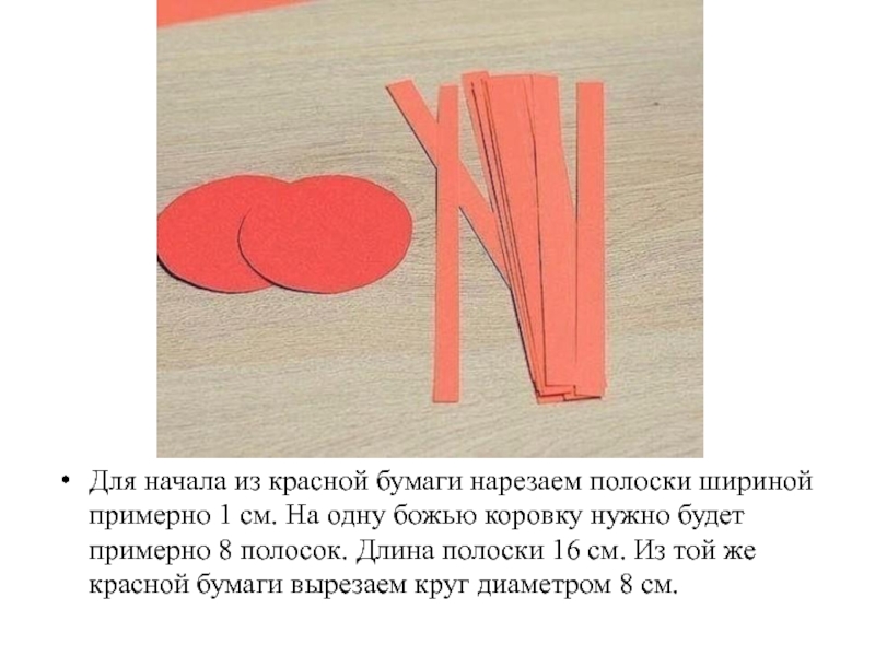 Для начала из красной бумаги нарезаем полоски шириной примерно 1 см. На одну божью коровку нужно будет