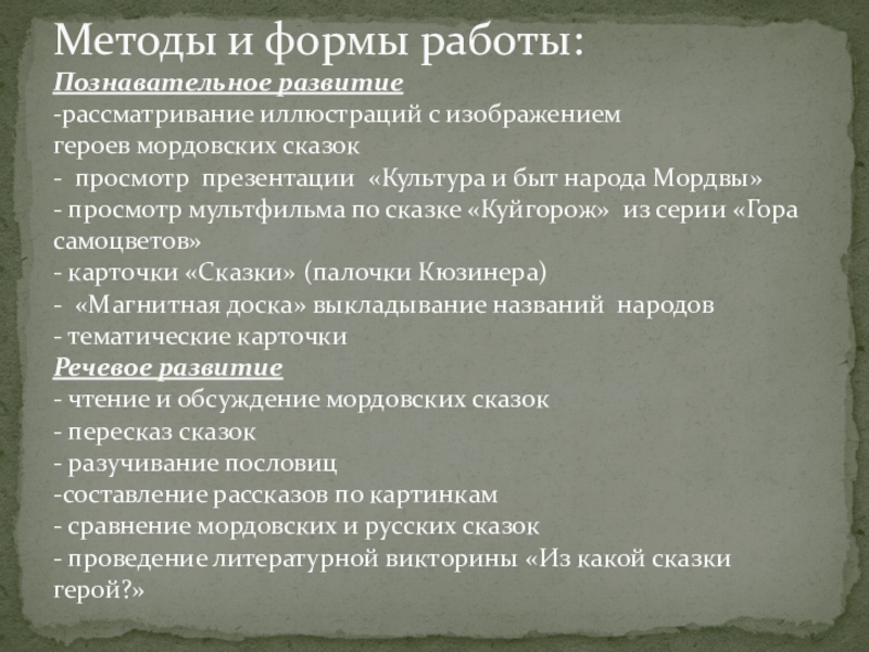Слайд 8Методы и формы работы: Познавательное развитие -рассматривание иллюстраций с изображением героев мордовских сказок - просмотр