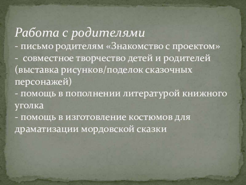 Слайд 10Работа с родителями - письмо родителям «Знакомство с проектом» - совместное творчество детей