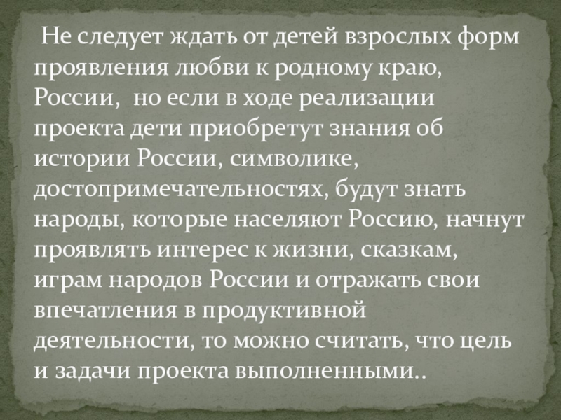 родному краю, России, но если в ходе реализации проекта дети приобретут знания об истории России, символике, достопримечательностях, будут знать народы, которые населяют Россию, начнут проявлять интерес к жизни, сказкам, играм народов России и отражать свои впечатления в продуктивной деятельности, то можно считать, что цель и задачи проекта выполненными..