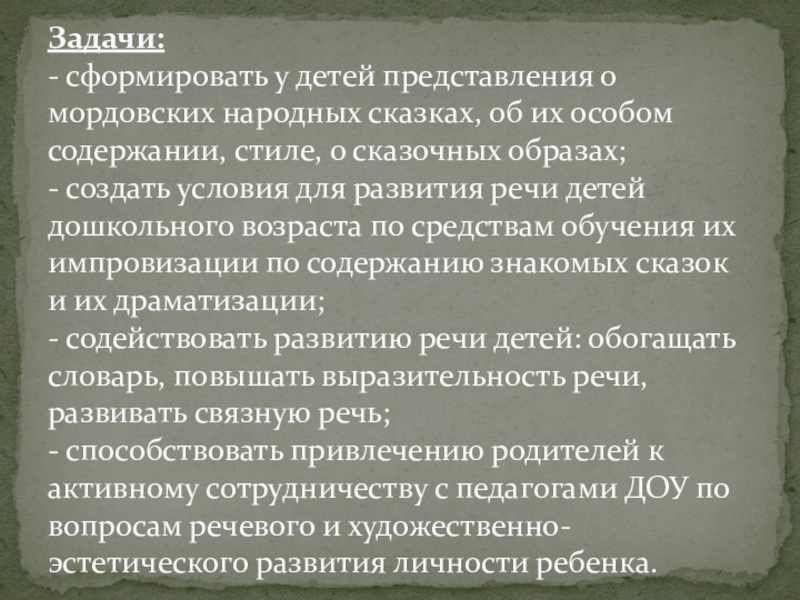 Слайд 5Задачи: - сформировать у детей представления о мордовских народных сказках, об