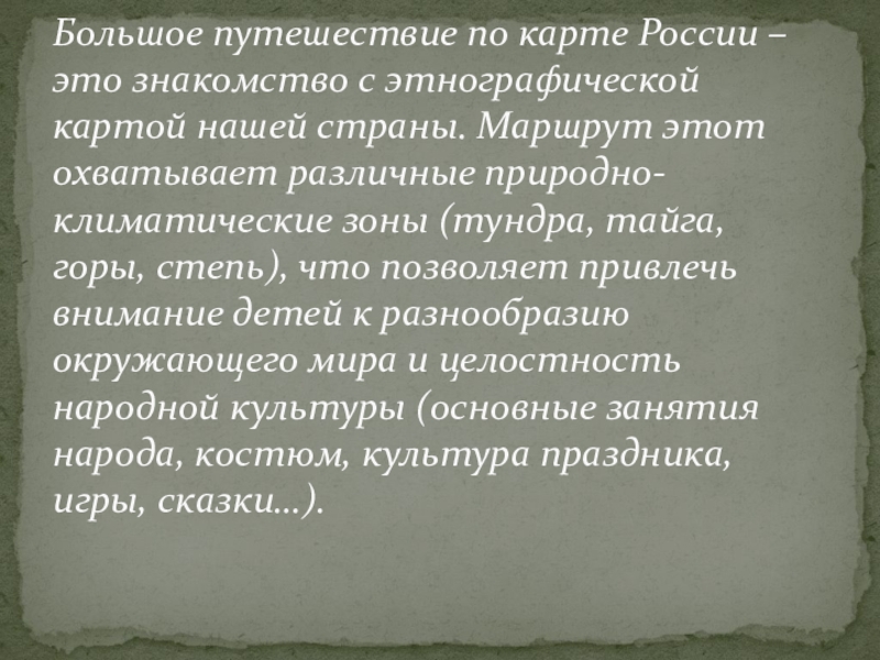 Большое путешествие по карте России – это знакомство с этнографической картой нашей страны. Маршрут этот охватывает различные природно-климатические зоны (тундра, тайга, горы, степь), что позволяет привлечь внимание детей к разнообразию окружающего мира и целостность народной культуры