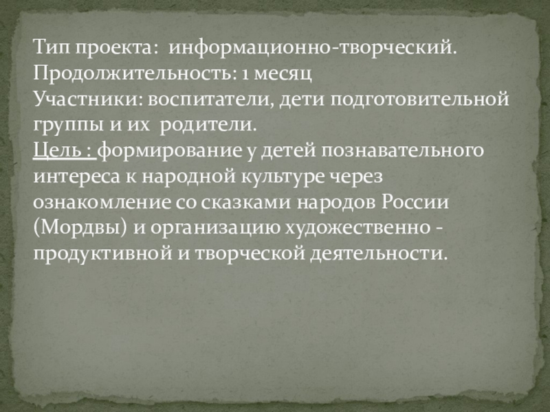 Слайд 4Тип проекта: информационно-творческий. Продолжительность: 1 месяц Участники: воспитатели, дети подготовительной группы и их