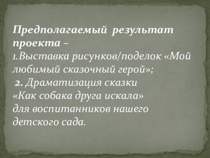 Предполагаемый результат проекта –  1.Выставка рисунков/поделок «Мой любимый сказочный герой»;  2. Драматизация сказки  «Как