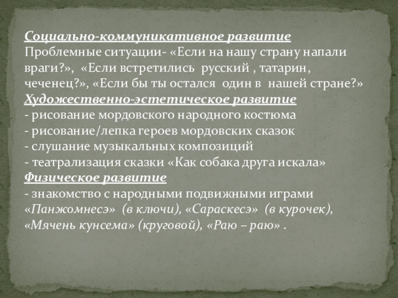 русский , татарин, чеченец?», «Если бы ты остался один в нашей стране?» Художественно-эстетическое развитие - рисование мордовского народного костюма - рисование/лепка героев мордовских сказок - слушание музыкальных композиций - театрализация сказки «Как собака друга искала» Физическое развитие - знакомство с народными подвижными играми «Панжомнесэ» (в ключи), «Сараскесэ» (в курочек), «Мячень кунсема» (круговой), «Раю – раю» .