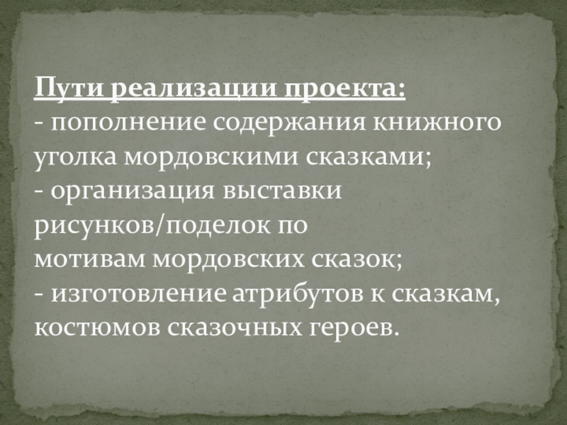 Пути реализации проекта: - пополнение содержания книжного уголка мордовскими сказками; - организация выставки рисунков/поделок по мотивам мордовских сказок;
