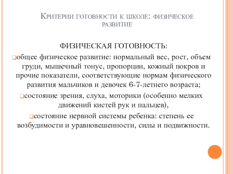 Слайд 3Критерии готовности к школе: физическое развитие