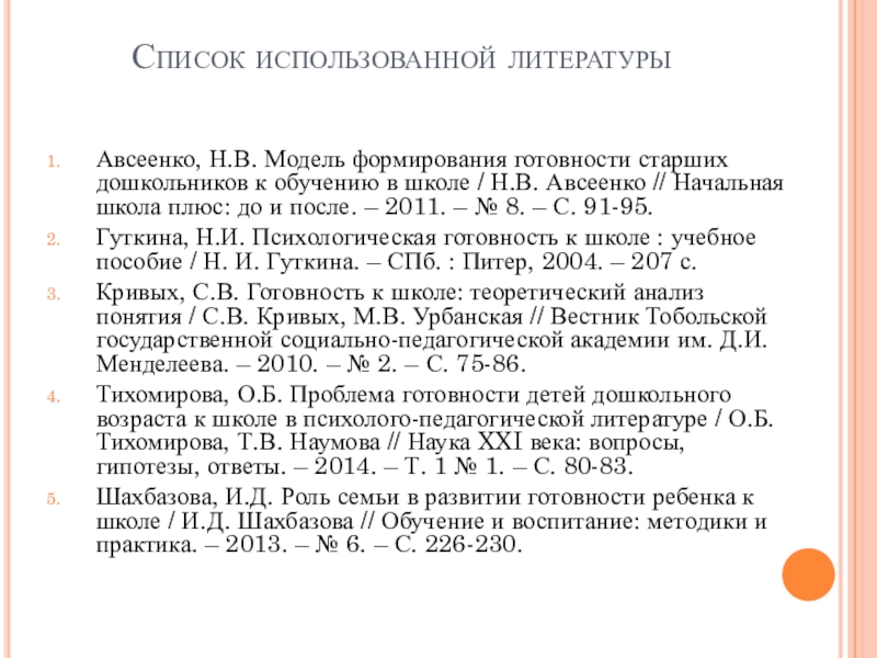 Кривых, С.В. Готовность к школе: теоретический анализ понятия / С.В. Кривых, М.В. Урбанская // Вестник Тобольской государственной социально-педагогической академии им. Д.И. Менделеева. – 2010. – № 2. – С. 75-86.