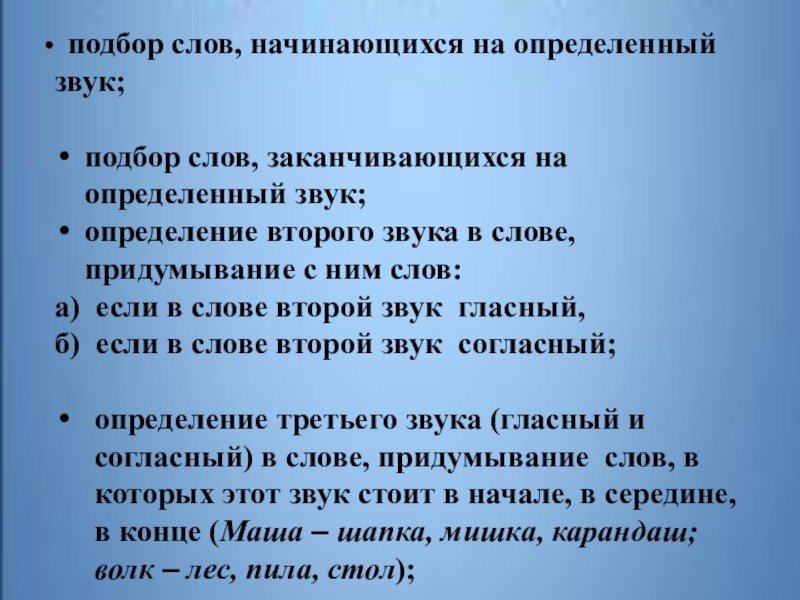 подбор слов, начинающихся на определенный звук;подбор слов, заканчивающихся на определенный звук;определение второго звука в слове, придумывание