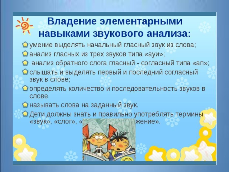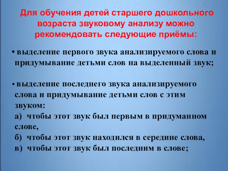 Для обучения детей старшего дошкольного возраста звуковому анализу можно рекомендовать следующие приёмы: выделение первого звука анализируемого