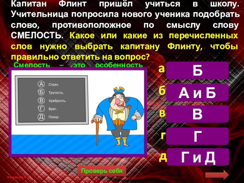 Капитан Флинт пришёл учиться в школу. Учительница попросила нового ученика подобрать слово, противоположное по смыслу слову СМЕЛОСТЬ. Какое или какие из перечисленных слов нужно выбрать капитану Флинту, чтобы правильно ответить на вопрос?