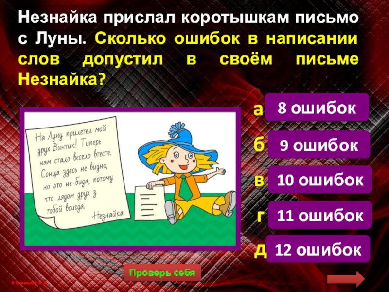 Незнайка прислал коротышкам письмо с Луны. Сколько ошибок в написании слов допустил в своём письме Незнайка?