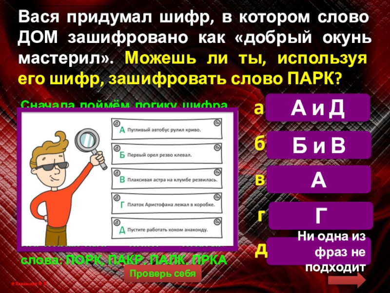 мастерил». Можешь ли ты, используя его шифр, зашифровать слово ПАРК?