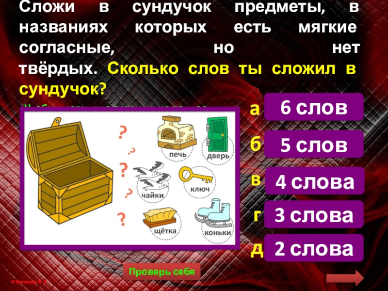 Сложи в сундучок предметы, в названиях которых есть мягкие согласные, но нет