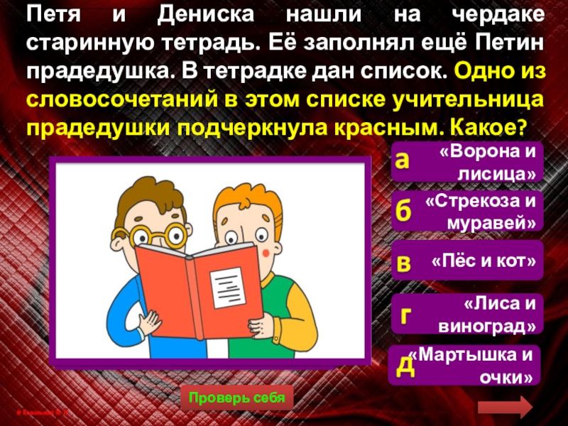 Петя и Дениска нашли на чердаке старинную тетрадь. Её заполнял ещё Петин прадедушка. В тетрадке дан список. Одно из словосочетаний в этом списке учительница прадедушки подчеркнула красным. Какое?