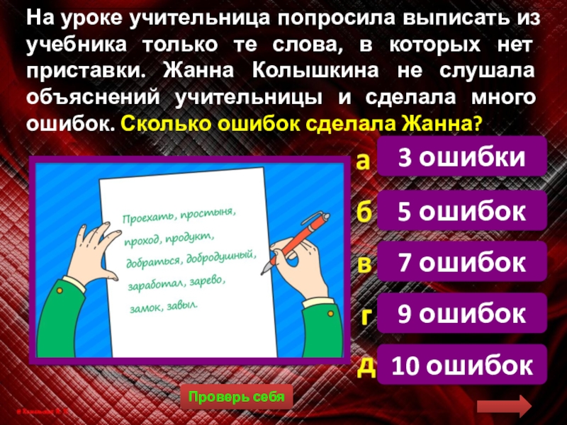 На уроке учительница попросила выписать из учебника только те слова, в которых нет приставки. Жанна Колышкина не слушала объяснений учительницы и сделала много ошибок. Сколько ошибок сделала Жанна?