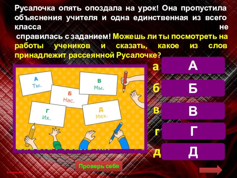 справилась с заданием! Можешь ли ты посмотреть на работы учеников и сказать, какое из слов принадлежит рассеянной Русалочке?