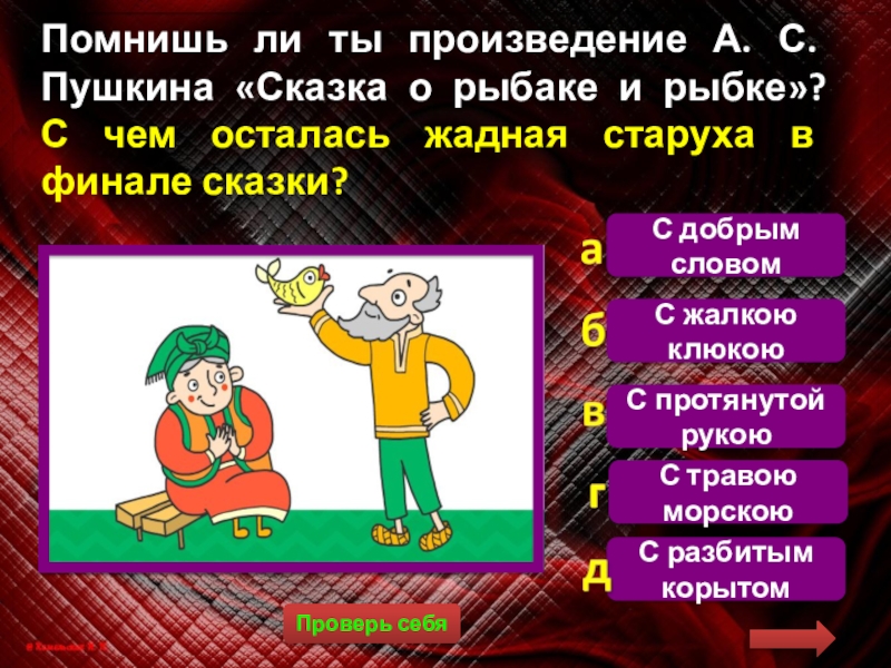Помнишь ли ты произведение А. С. Пушкина «Сказка о рыбаке и рыбке»?
