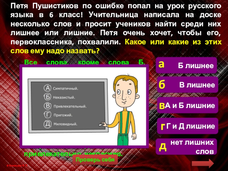 Петя Пушистиков по ошибке попал на урок русского языка в 6 класс! Учительница написала на доске несколько слов и просит учеников найти среди них лишнее или лишние. Петя очень хочет, чтобы его, первоклассника, похвалили. Какое или какие из этих слов ему надо назвать?