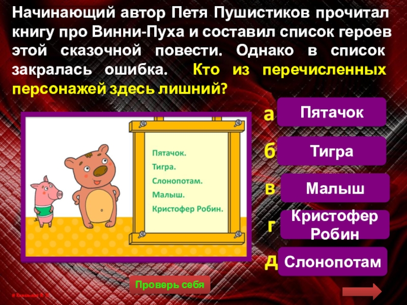 Начинающий автор Петя Пушистиков прочитал книгу про Винни-Пуха и составил список героев этой сказочной повести. Однако в список закралась ошибка. Кто из перечисленных персонажей здесь лишний?