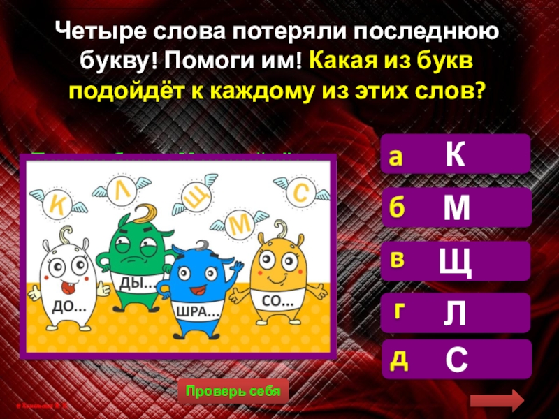 Четыре слова потеряли последнюю букву! Помоги им! Какая из букв подойдёт к каждому из этих слов?